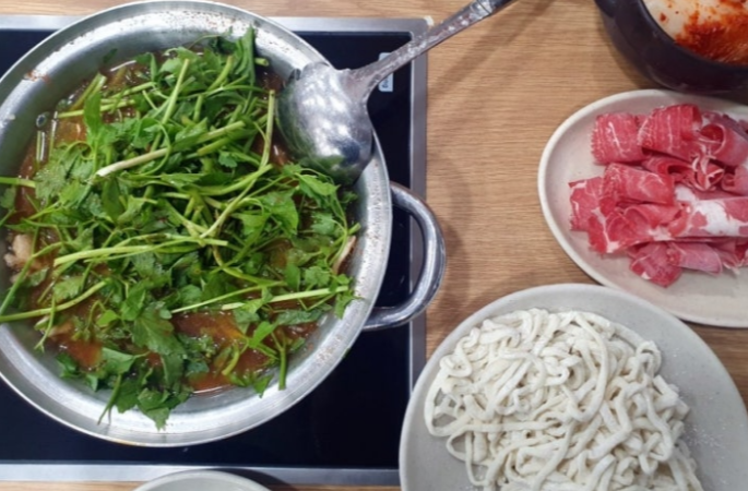 - 해독의 왕, 미나리: 냄비 뚜껑이 닫히지 않을 정도로 수북하게 담겨 나오는 미나리는 겨울철 잃어버린 입맛을 돋우는 일등 공신입니다. 미나리는 해독 작용이 뛰어나고 피를 맑게 해 주어 운동 후 섭취하기에 가장 좋은 식재료 중 하나입니다.