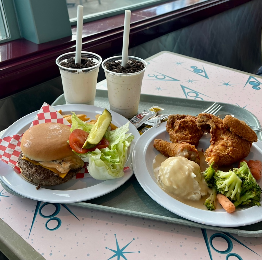 - 플로의 V8 카페 (Flo's V8 Cafe) : 66번 국도의 클래식 다이너 컨셉 식당입니다. 든든한 아메리칸 버거, 프라이즈, 셰이크 등 다양한 메뉴가 있지만, 특히 수제 밀크셰이크가 인기가 높습니다. 멋진 카스 랜드 풍경을 감상하며 식사를 즐길 수 있습니다. 동양인에게 양은 좀 많은 편이니 메뉴는 1인당 1개 정도면 적당합니다